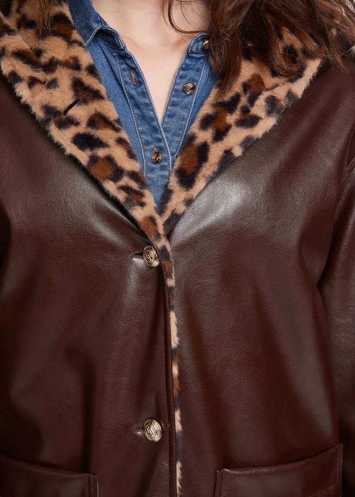 Get in on the fashion game with the GAUDI leopard trench coat! This bold and elegant women's jacket is the perfect addition to your wardrobe. Made from high-quality faux leather, this double-breasted trench coat features a lapel collar, logo buttons and a matching belt to accentuate your figure.