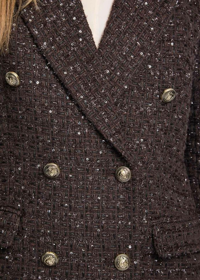 Discover the perfect GAUDI boucle jacket that combines elegance and style! This double-breasted jacket is made from a luxurious blend of wool and lurex, complemented by glittering sequins and gold buttons to provide you with a dazzling look.