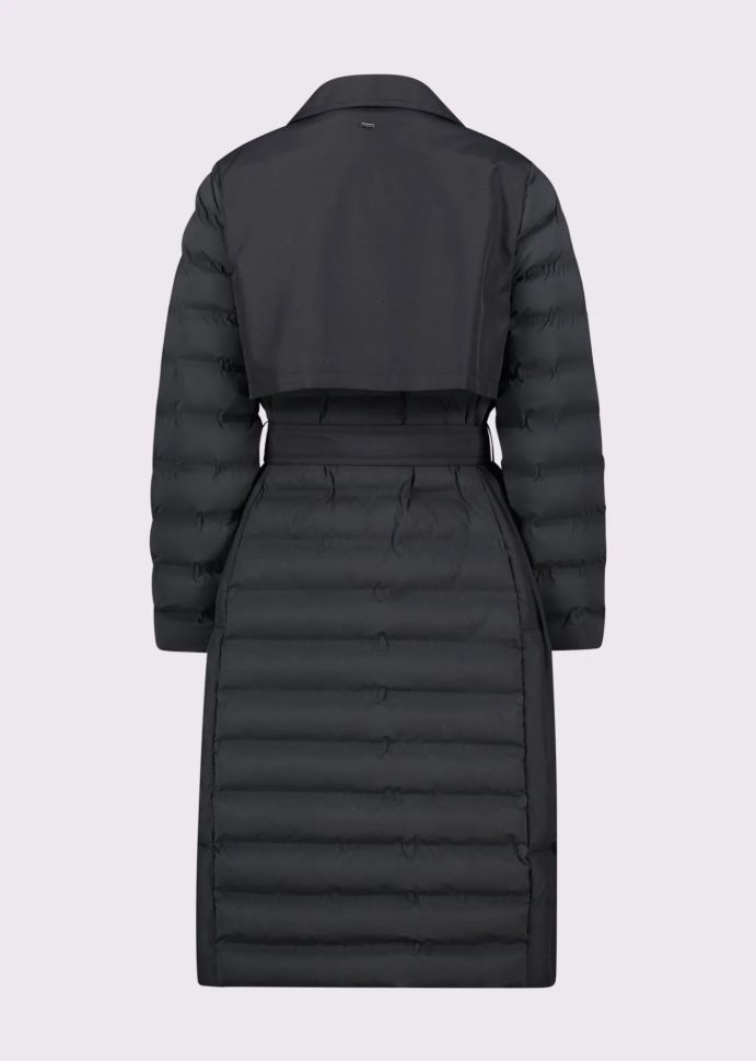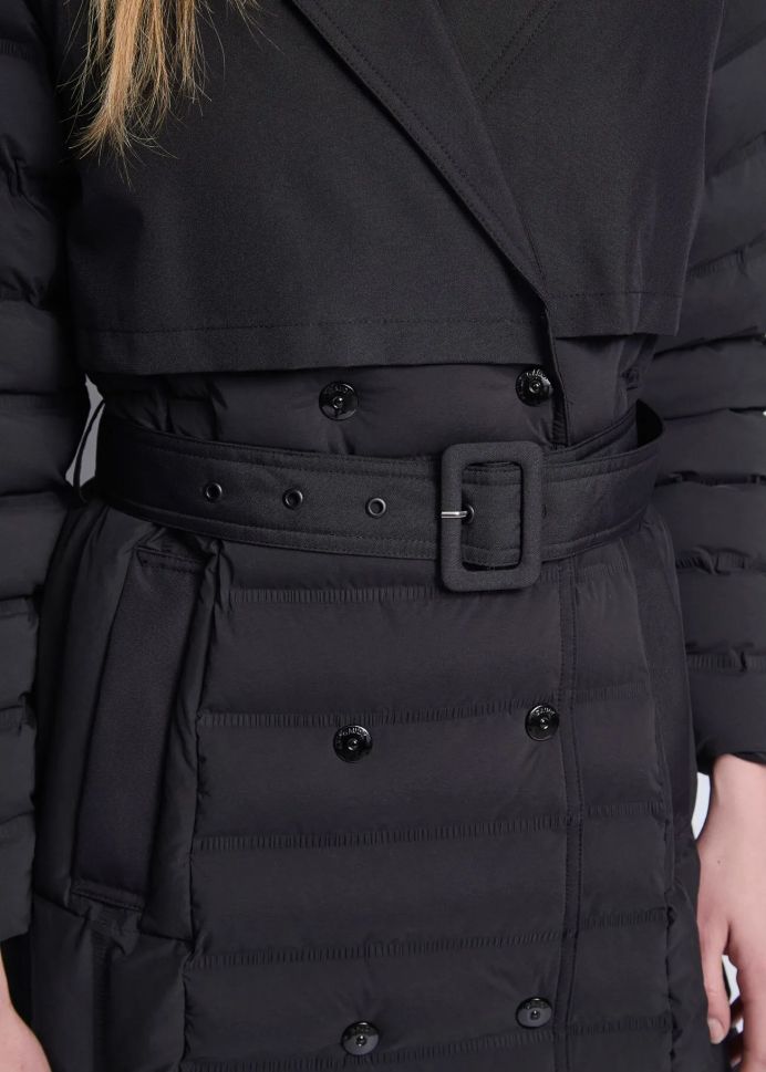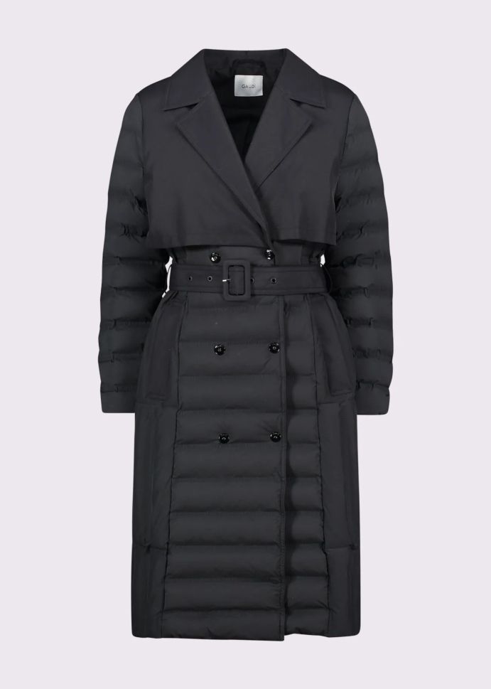 Elegant black GAUDI trench coat, ideal for urban chic! The double-breasted design and quilted, quilted nylon provide warmth and comfort. The matching belt emphasizes the silhouette.