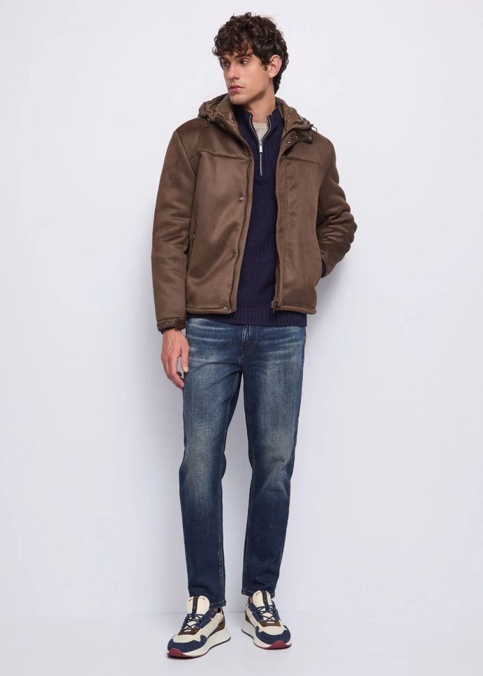 The jacket is easy to maintain, thanks to the polyester composition. Machine wash at low temperature or dry cleaning is recommended to preserve the quality and appearance of the suede.