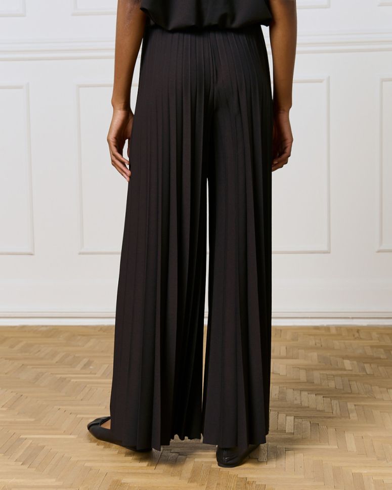 Elegant women's pleated pants ACCESS FASHION. With wide legs and comfortable elastic waist. Made of 50% recycled polyester, silk and spandex. With high waist and hidden zipper closure. Black color, easy to combine with a suitable top.