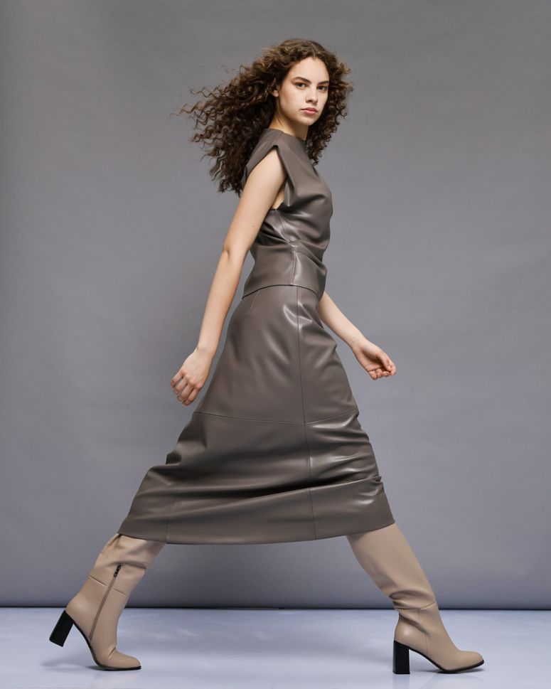 Elegant and stylish long leather skirt by ACCESS FASHION. This midi skirt with a high waist emphasizes the figure and gives a sophisticated look. Hidden zipper at the back for easy fastening and comfortable lining. In gray color, made of 100% polyester. Combine with the matching top from the series for a complete look.