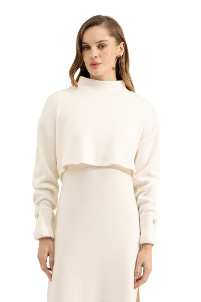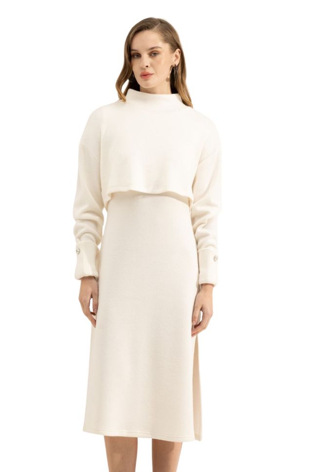 The dress has a clean and stylish design in white, which makes it easy to combine with various accessories and shoes. It is made of high-quality knitwear, providing softness and comfort when worn. The unique two-piece construction – a bolero with sleeves and a raised collar, adds additional charm and sophistication to your look.