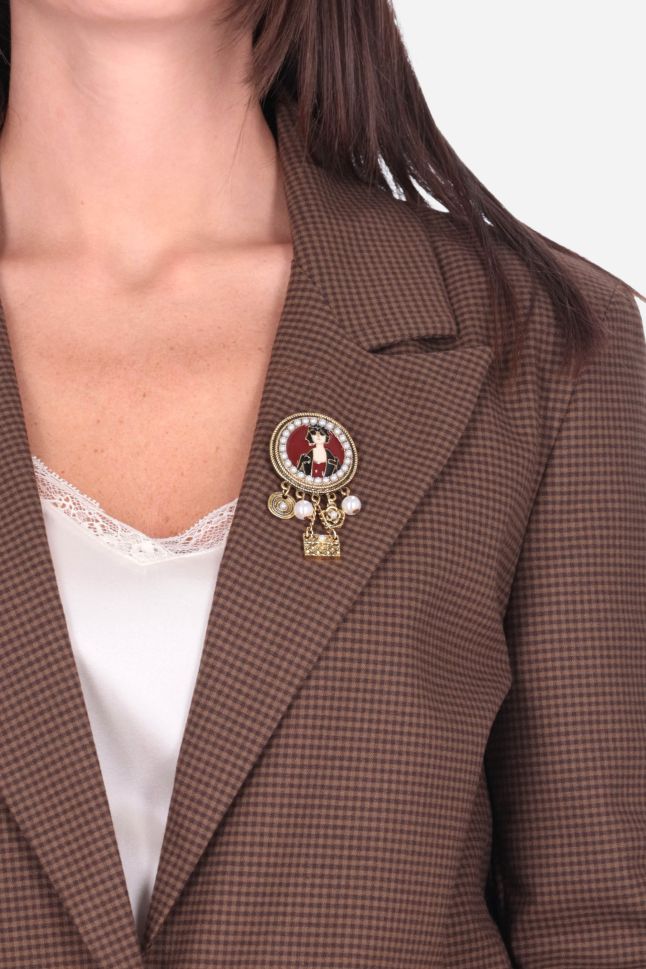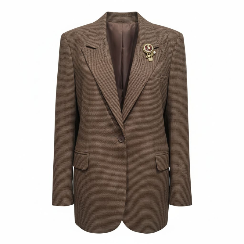 The jacket is equipped with a stylish vintage-style brooch, which adds a unique and sophisticated accent. The button fastening is practical and elegant, making the jacket easy to wear and combine with different outfits.