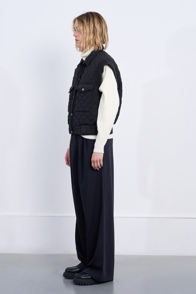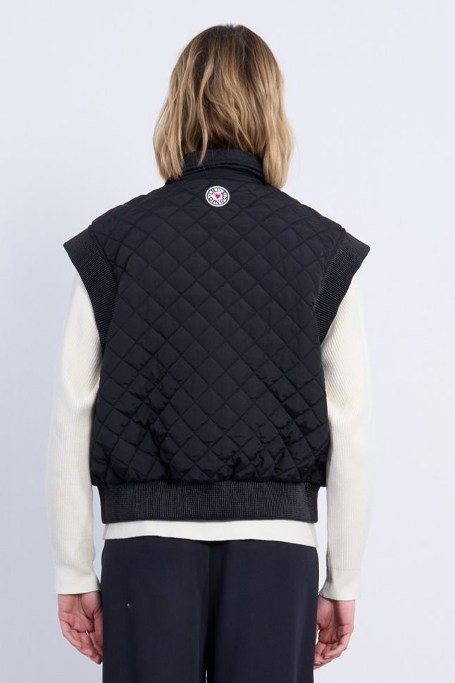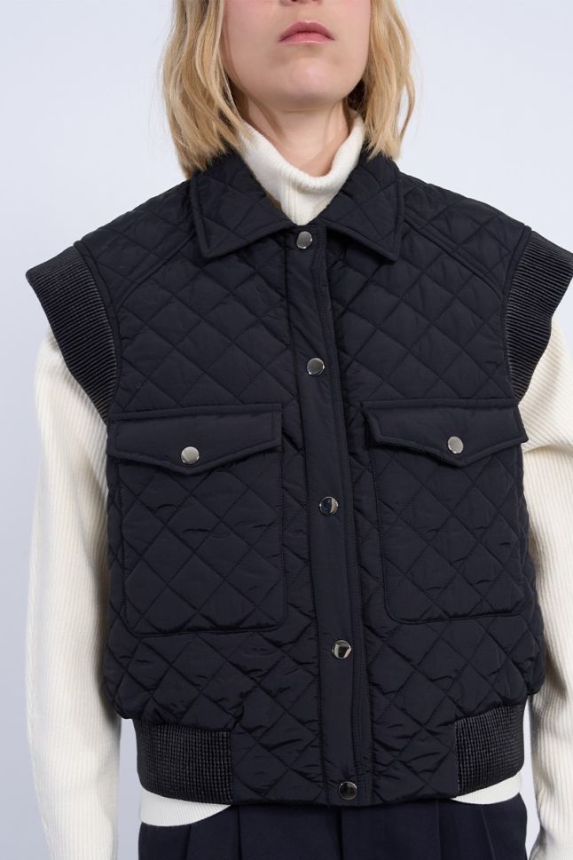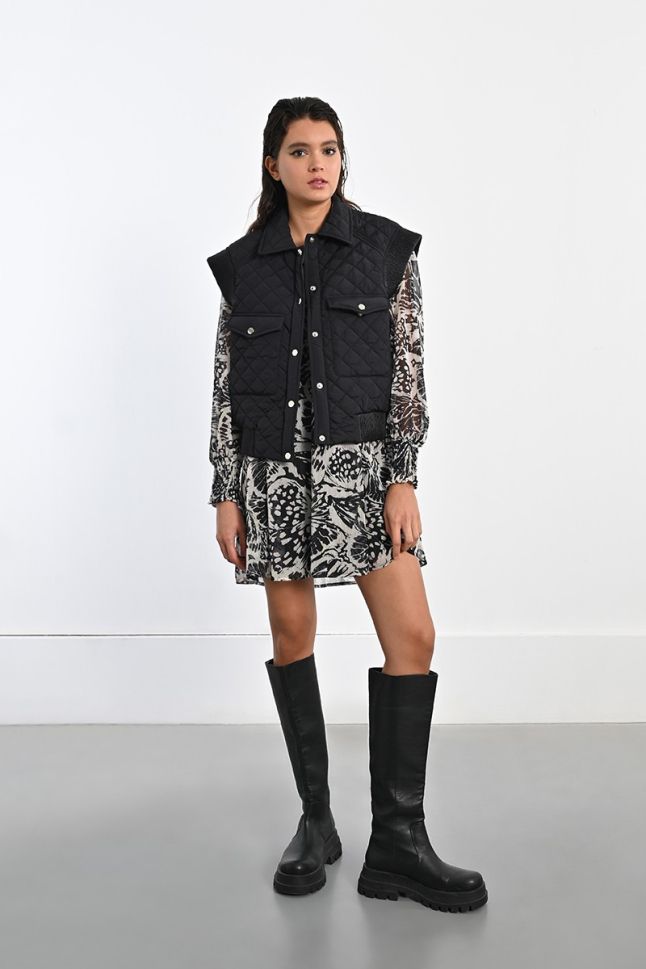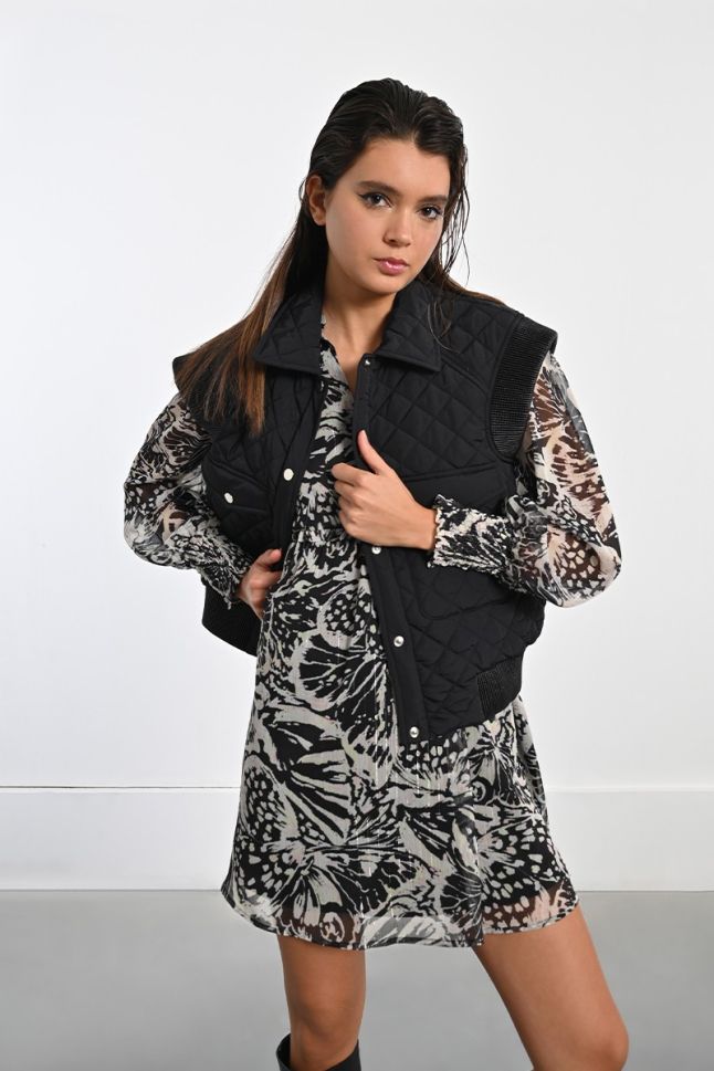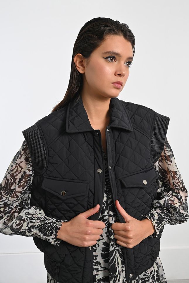 * Sleeveless model: Freedom of movement and the ability to combine with different clothes. * Slightly shortened length: A modern silhouette that emphasizes the waist. * Quilted: Provides optimal warmth and comfort. * Regular fit cut: Suitable for any figure, ensuring comfort when wearing. * Black color: Classic and versatile, easy to combine with other colors and styles. * Tic-tac button closure: Easy and quick to fasten. * Two flap pockets on the front: Practical for storing personal items. * Material: 100% polyester - lightweight, durable and easy to maintain.This quilted jacket is a perfect addition to your wardrobe, providing you with style and warmth in spring and autumn. Whether you are walking in the park or meeting friends, this jacket will make you feel comfortable and elegant.