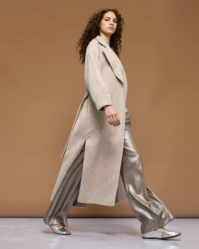 Design and Materials: This exceptional coat is made of 100% mixed materials, ensuring comfort and durability. Its wide line guarantees freedom of movement, while the built-in lining keeps you warm on cold days. The delicate stones adorning the coat add a subtle touch of sparkle and sophistication.