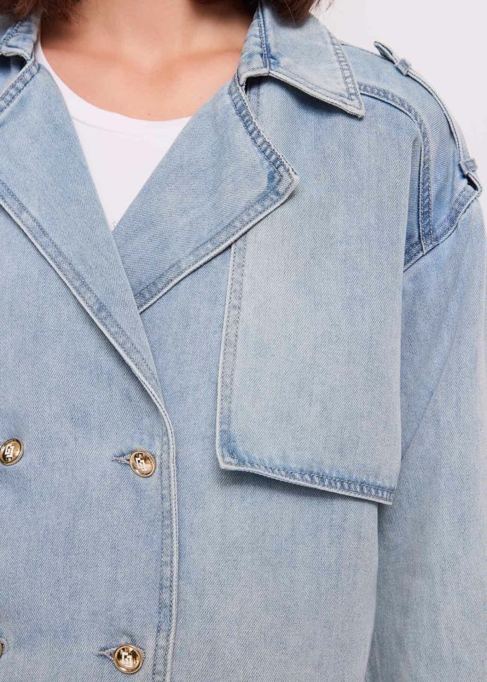 The jacket is made of light blue denim, which is easy to combine with different colors and fabrics. The double-breasted fastening gives a sophisticated look, and the straight, loose cut guarantees comfort and freedom of movement. The standard length makes it suitable for wearing with skirts, dresses, trousers and jeans.