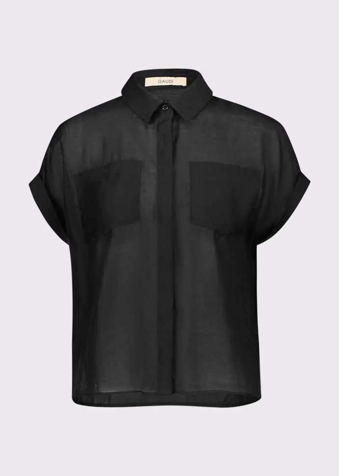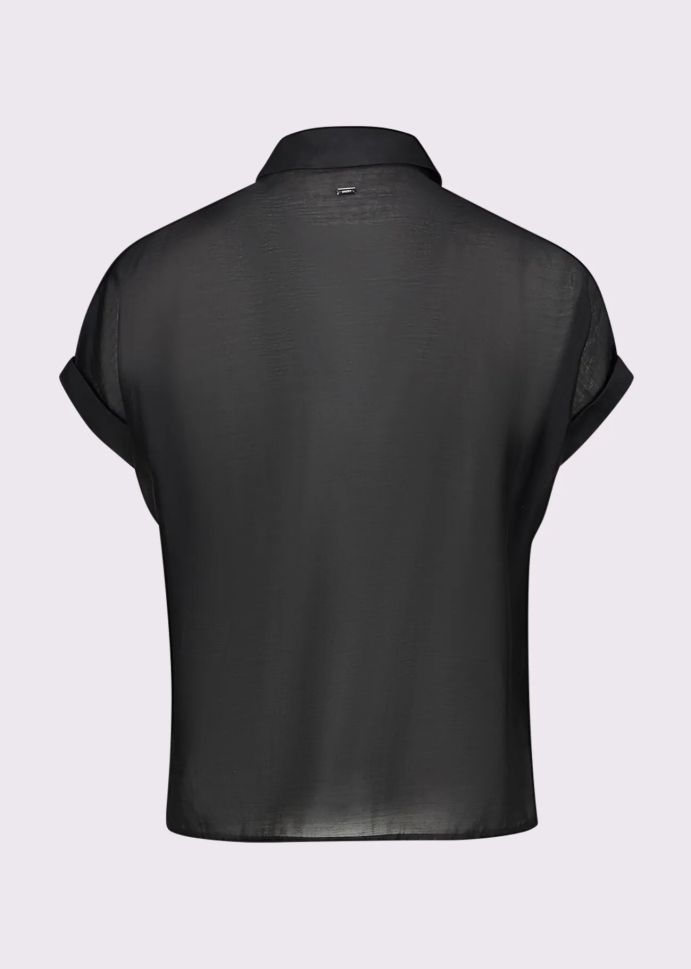 The shirt has a loose straight cut and standard length, making it extremely comfortable to wear all day long. Short sleeves add to the casual elegance, while the translucent black color adds mystery and style.