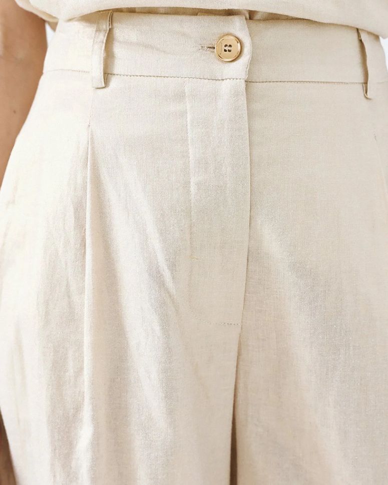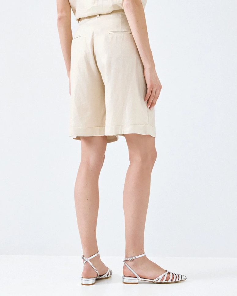 Discover the elegant ACCESS FASHION women's trousers! With their golden hue, these shorts will add style to your look. With a high waist, front pleats and leg hems, they are perfect for any occasion. They fasten with a button and zip and are made of 55% linen and 45% bamboo for comfort.