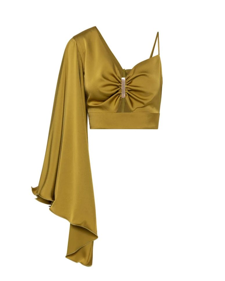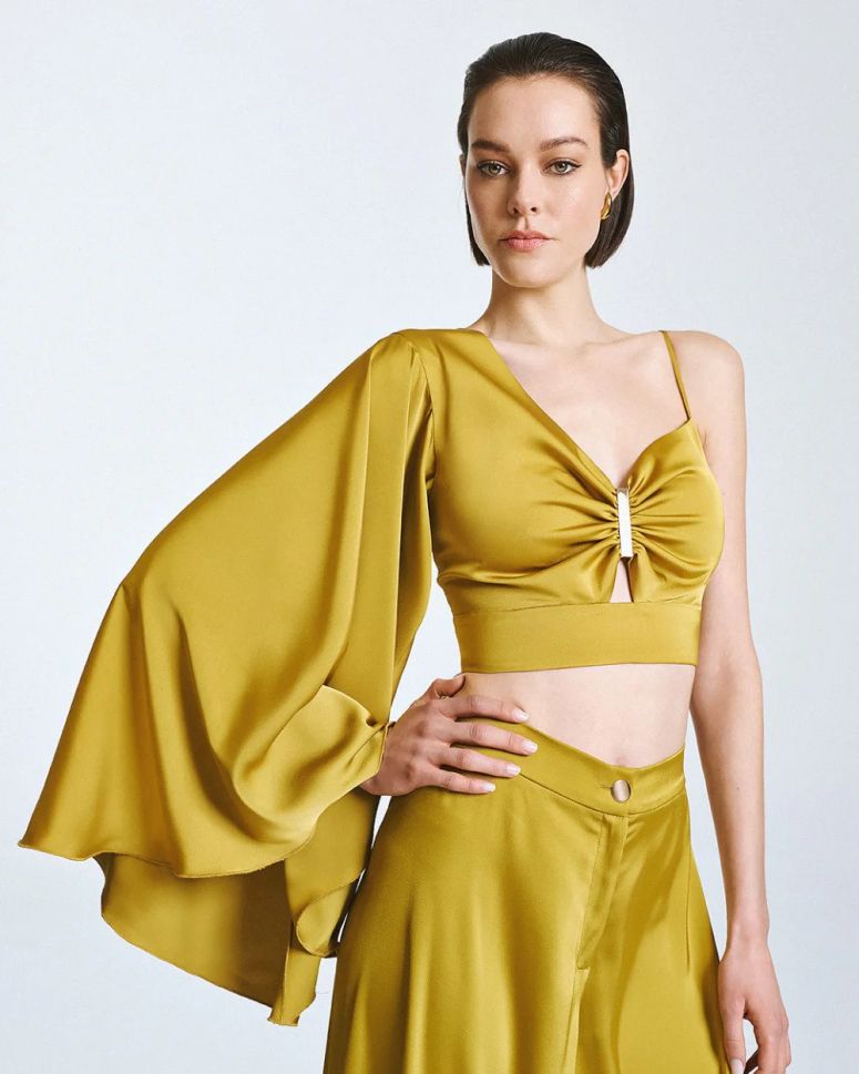 A sophisticated women's shirt from ACCESS FASHION, combining style and comfort. Unique model with one sleeve with veil and short length. Elegant open neckline with metal detail on the bust and zipper closure on the back. Made of satin fabric in mustard color. Composition: 51% Recycled Polyester, 49% Polyester, regular fit cut.