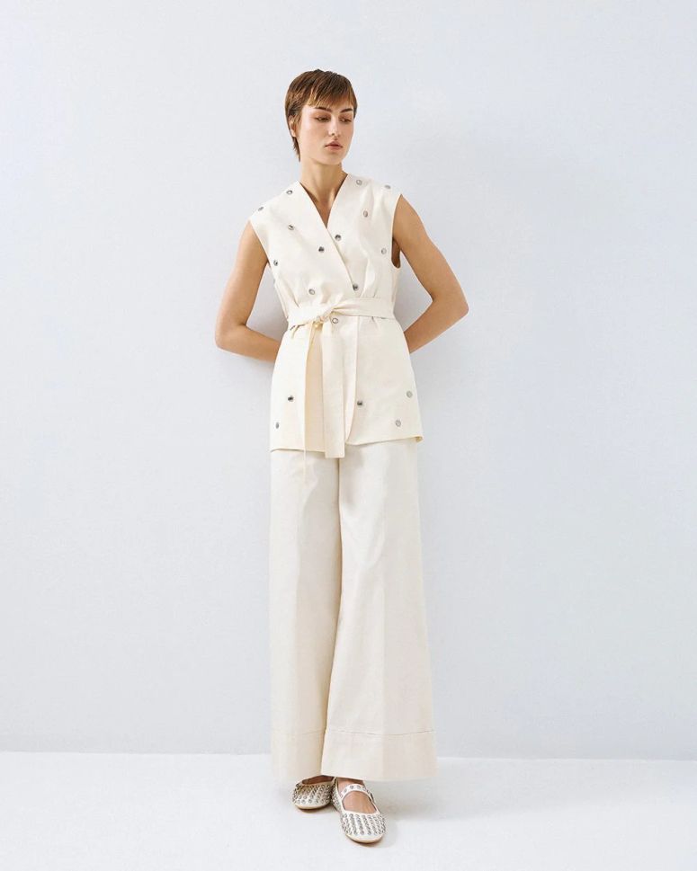 The light cream color of the vest makes it easy to combine with different clothes and accessories. The unique accent of the model is the eyelets, which give it a playful and modern look.