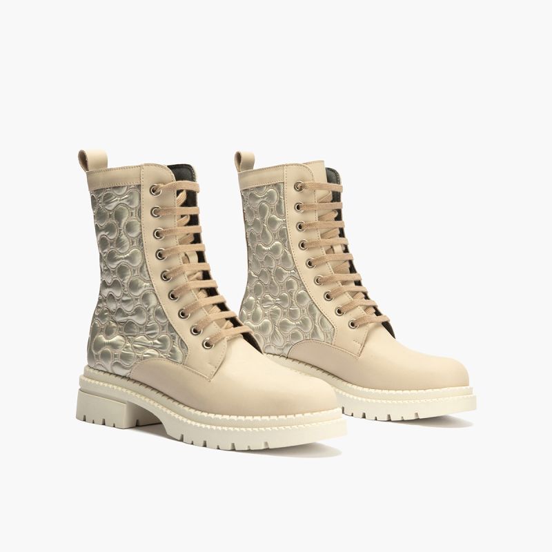 Тези боти са изработени от висококачествени материали, гарантиращи дълготрайност и удобство. Кремавият цвят придава изискан вид, който лесно се комбинира с различни стилове облекло – от ежедневни дънки до елегантни рокли.