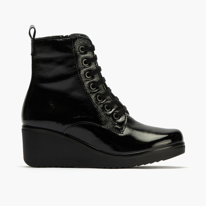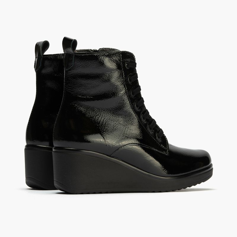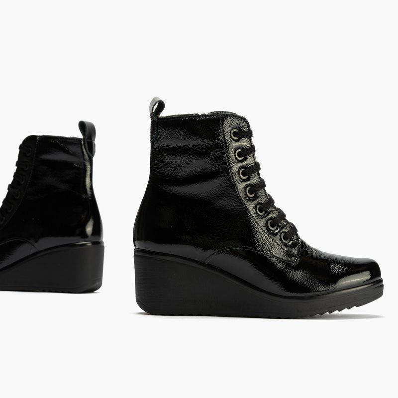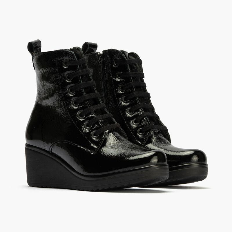 Тези стилни дамски боти са изработени от естествен лак в класически черен цвят. Кожената стелка осигурява максимален комфорт при носене. Закопчаването е двойно – с цип и връзки, за перфектно прилягане към крака.