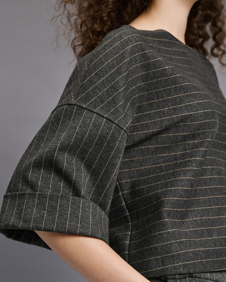 Блузата е проектирана с елегантно лодка деколте, което деликатно подчертава ключиците и придава женственост на силуета. 3/4 ръкавите добавят нотка изтънченост и я правят подходяща за носене през различни сезони. Със своята скъсена дължина и права кройка, тази блуза е перфектна за комбиниране с дънки, поли или панталони с висока талия, като създава модерен и стилен вид.