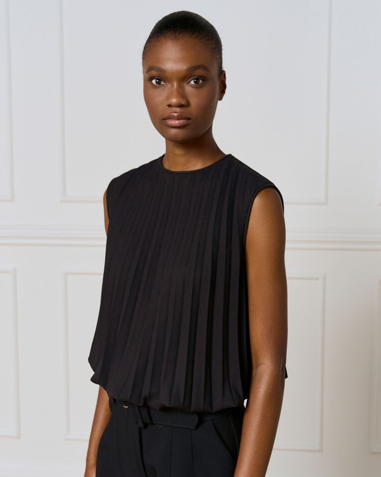 Елегантен черен плисиран топ от ACCESS FASHION, идеален за стилна визия. С къса дължина и обло деколте, той е изработен от 50% рециклиран полиестер, коприна и спандекс за комфорт и еластичност. С свободна кройка и закопчаване с копче.