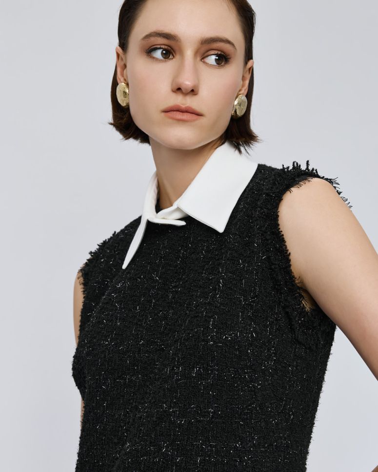 Тази черна туид рокля е изработена с внимание към детайла, като съчетава класическия туид с модерни акценти. Без ръкави е и е подходяща за различни сезони, позволявайки ви да я комбинирате с блейзър или жилетка в по-хладните дни. Удобните джобове отпред добавят практичност и стил, а подвижната яка и дантелените детайли придават уникален и женствен вид.