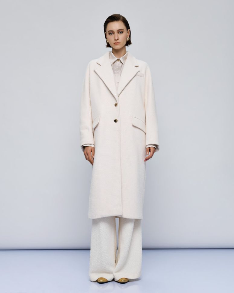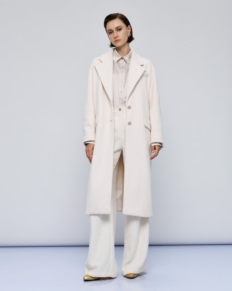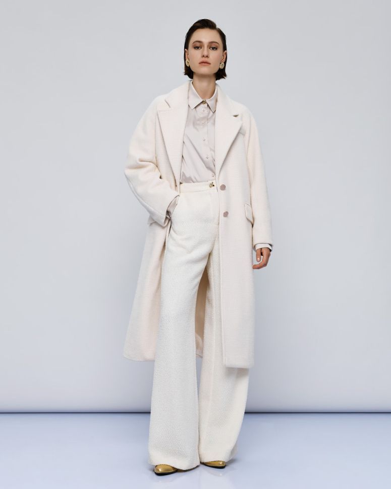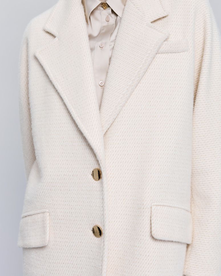 Палтото е обогатено с Lurex детайли, които добавят блясък и изтънченост към визията ви. Металното закопчаване с копчета отпред не само осигурява сигурно затваряне, но и допринася за цялостния елегантен вид на палтото.