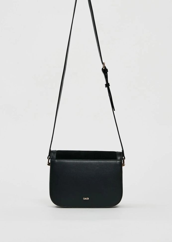 Елегантна черна crossbody чанта GAUDI - идеалният аксесоар! С регулируема презрамка и капак, размери 21 x 16 x 6 cm. Изработена от висококачествена еко кожа.