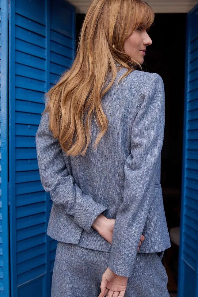 Сакото е с вталена кройка, която подчертава женствения силует и придава елегантност. Широката, прибрана яка добавя модерен акцент към визията. Закопчаването е с облечено копче в същия цвят като сакото, което придава изчистен и стилен вид. Джобовете с кант са функционални и допълват изискания дизайн.