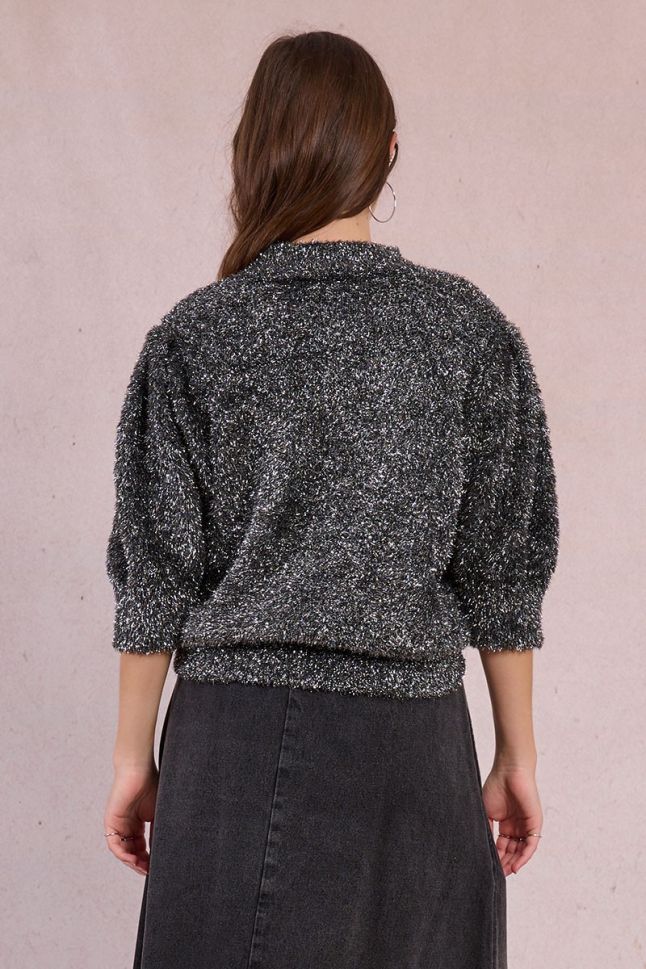 Блестящ дамски пуловер от MOLLY BRACKEN, съчетаващ стил и елегантност. Текстуриран плат с деликатен блясък, 3/4 балон ръкави и полу-вдигната яка.