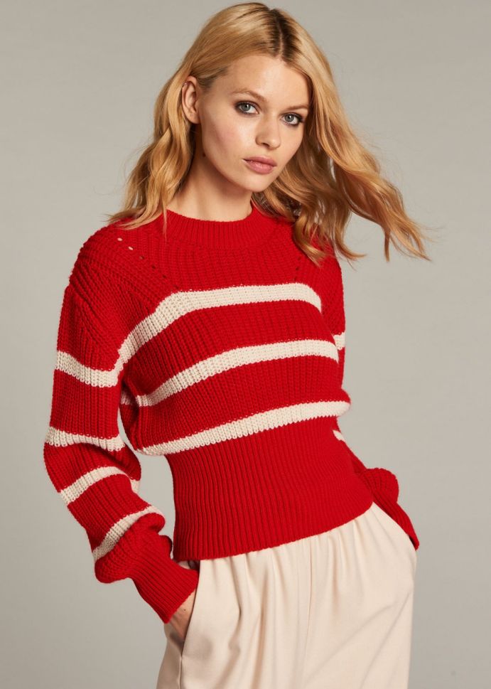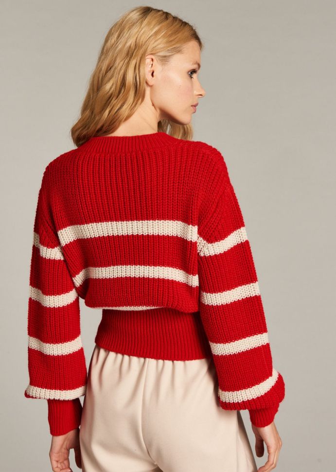Дизайн и характеристики: Този пуловер е изработен с едра, еластична плетка, която осигурява удобство и свобода на движение. Комбинацията от червено и бяло придава свеж и модерен вид. С обло деколте и скъсена дължина, този пуловер е идеален за комбиниране с дънки, поли или панталони с висока талия.