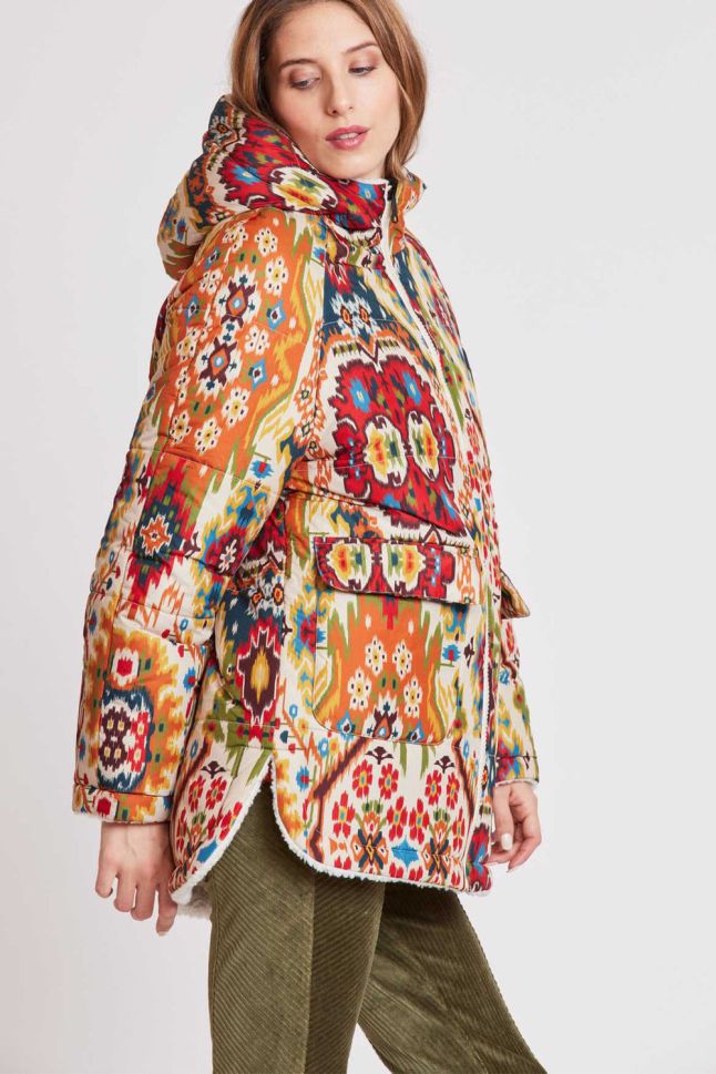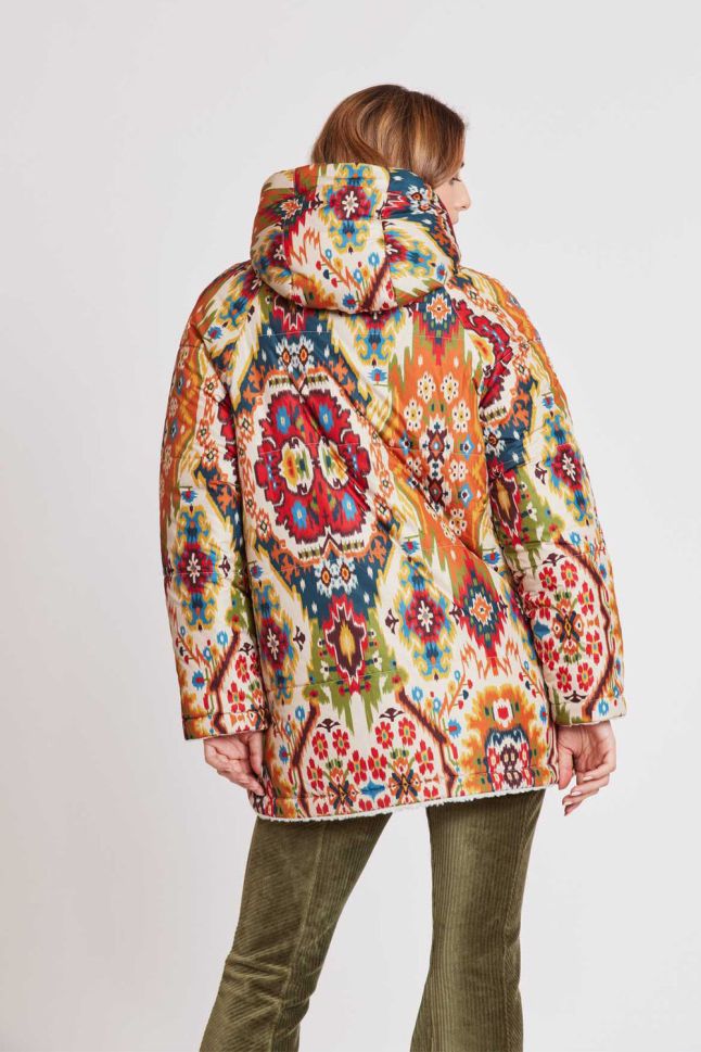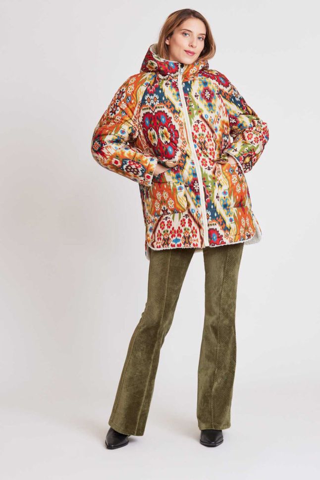 Това яке е проектирано с мисъл за съвременната жена. Неговата права кройка осигурява удобство и свобода на движение, докато средната дължина предлага оптимална защита от студа. Свежият десен с етно принт придава неповторим акцент на вашата визия, като ви позволява да изразите своята индивидуалност.