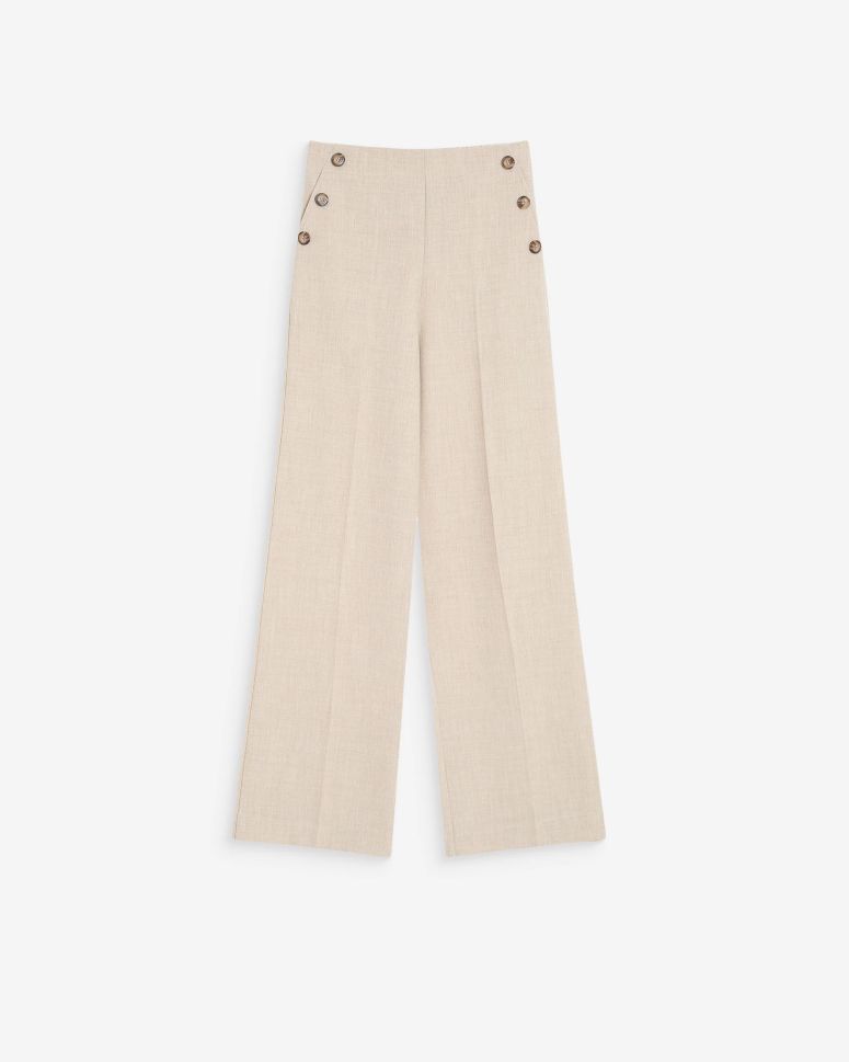 Стилното излъчване се допълва от декоративните копчета разположени в областта на джобовете, а свободният разкроен крачол прави линията издължена и женствена, което придава модерен силует.