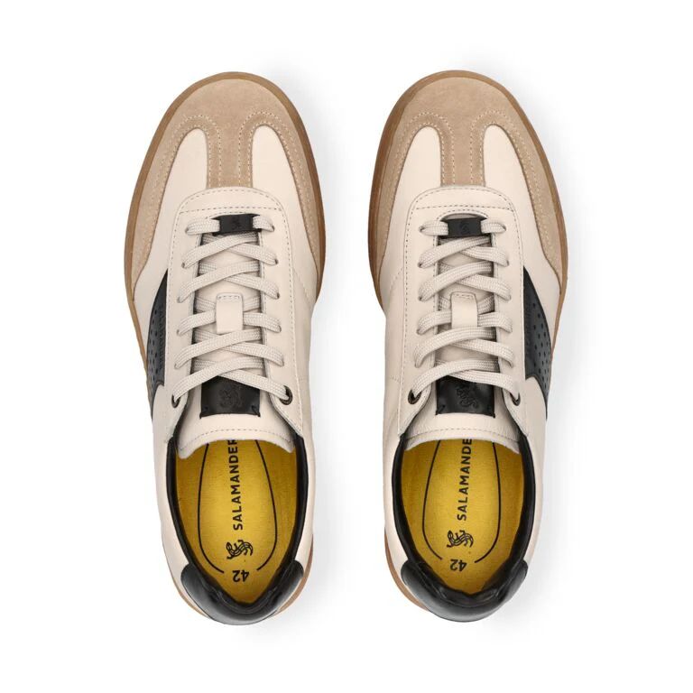 - Тези мъжки маратонки съчетават зърнеста гладка кожа и мек велур, за да създадат отличителен вид в почти бяло и бежово с черни акценти.