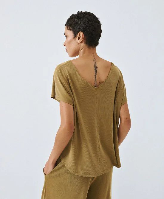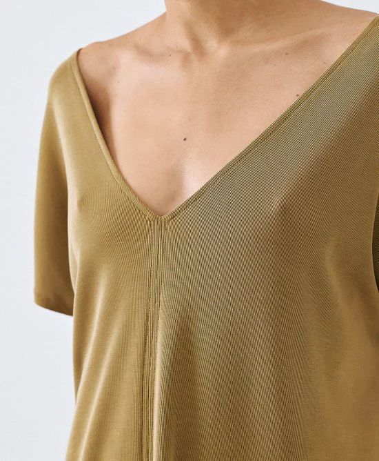 Блуза с V-образно деколте и V-образен гръб, къси ръкави и декоративни шевове.