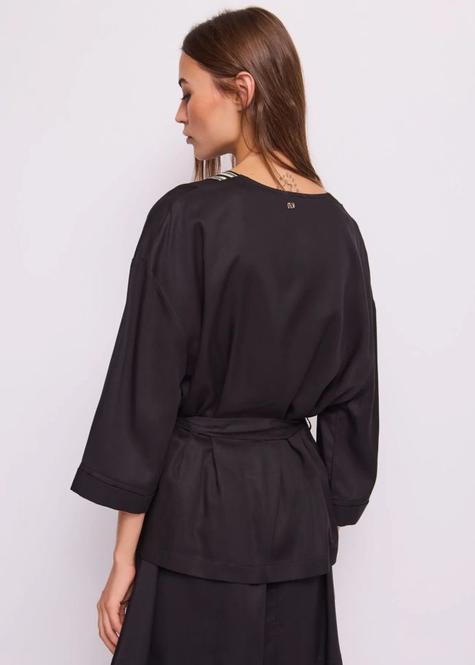 Потопете се в елегантността с това черно кимоно от GAUDI. Съчетавайки комфорт и стил, то е изработено от 100% лиоцел за несравнимо усещане. С V-образно деколте, свободна кройка и колан на талията, то подчертава женствеността. Контрастните кантове добавят изискан завършек.