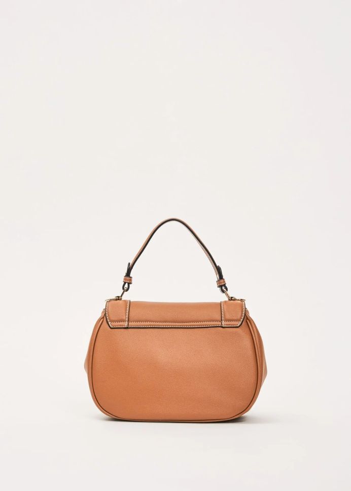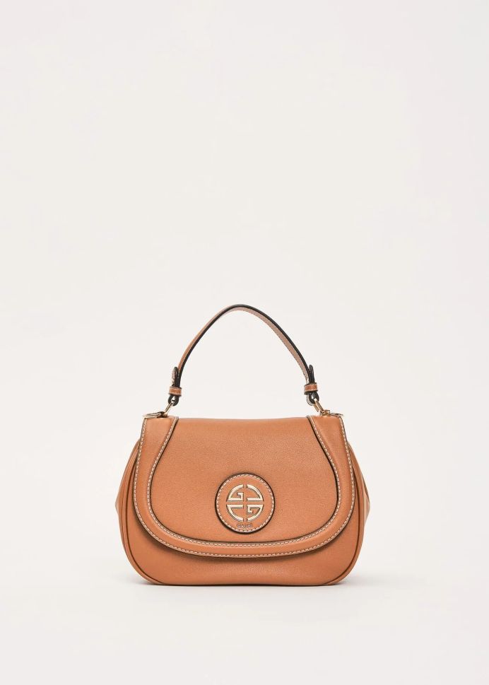 Елегантна дамска чанта GAUDI с горна дръжка в топъл кафяв цвят. Изработена от висококачествена еко кожа с метално лого.