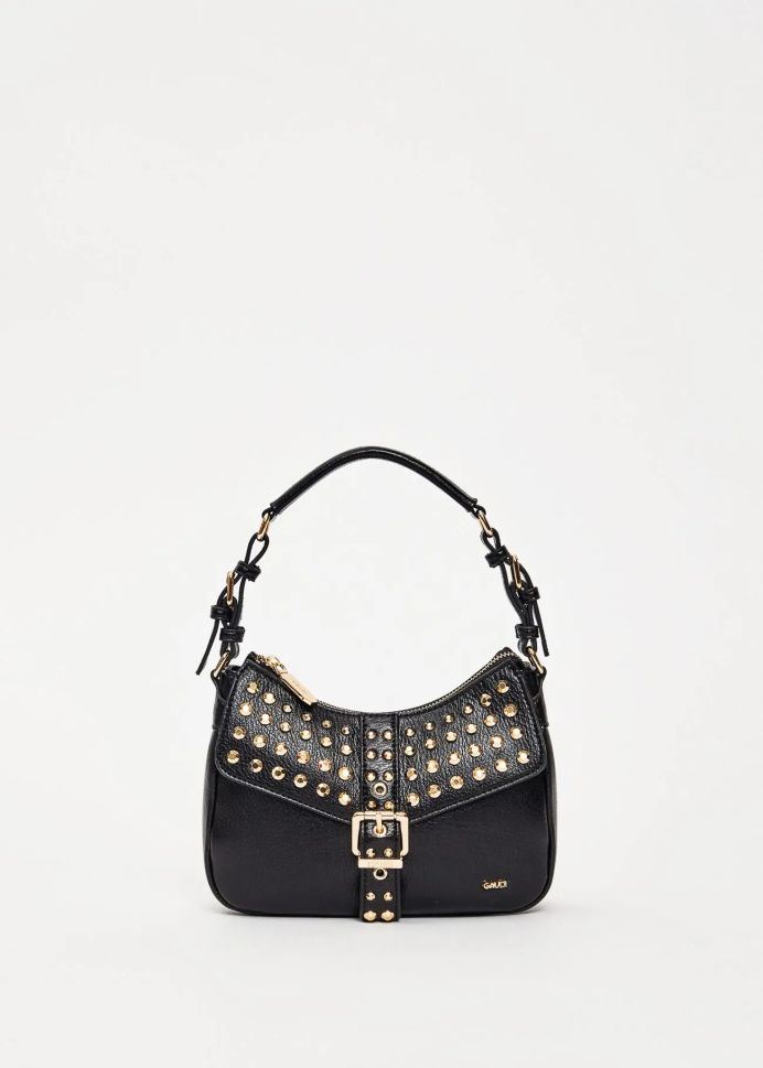 Представяме ви стилната черна мини чанта GAUDI, модел 12813, с акцент върху златните капси.