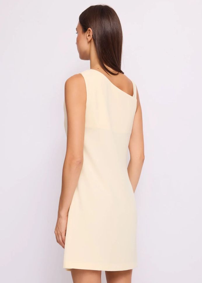 Роклята е в нежен ванилов цвят, който придава изисканост и класа. Без ръкави, тя е идеална за топлите дни и позволява да я комбинирате с любимите си аксесоари. Вталената кройка подчертава фигурата ви, докато дължината над коляното придава младежки и модерен вид.