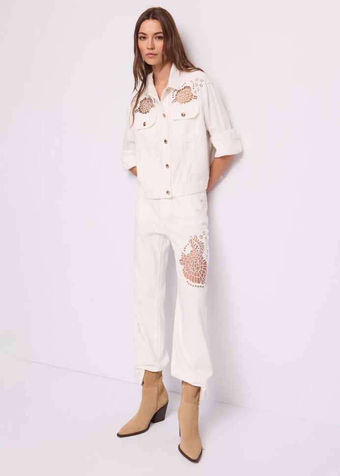 Освежете гардероба си с това бяло дамско дънково яке от GAUDI. Отличава се с лазерно изрязани флорални детайли и права регуларна кройка.