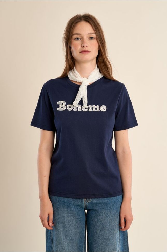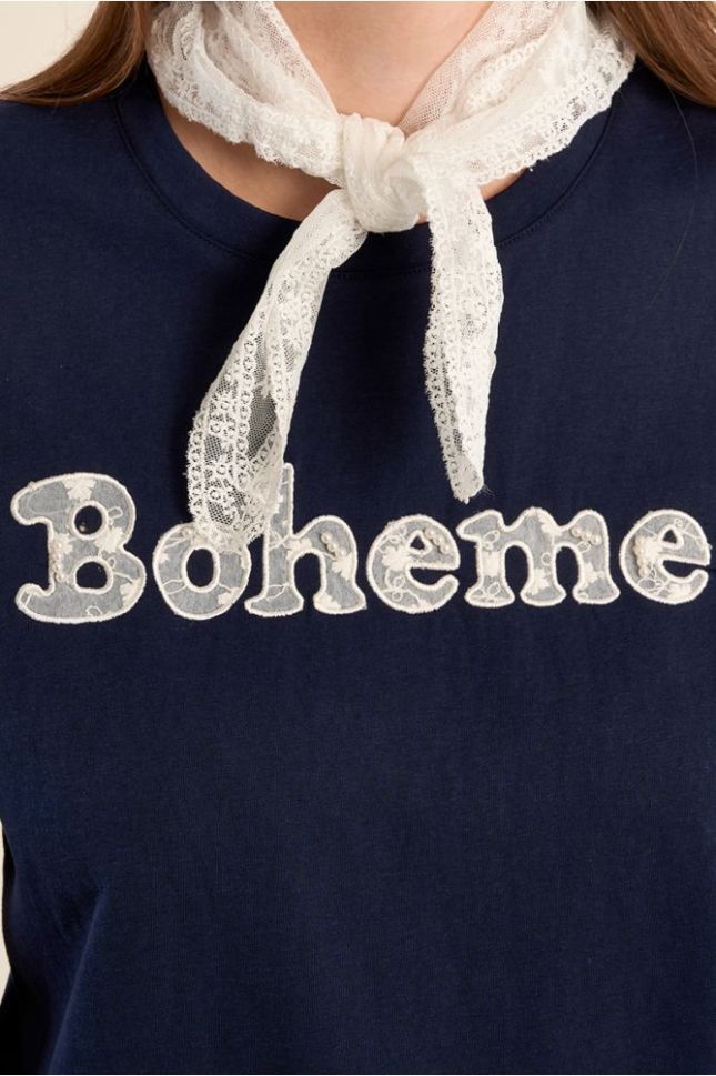 Тази изключителна тениска е създадена, за да подчертае вашата индивидуалност. Със своята регулар фит кройка и стандартна дължина, тя осигурява удобство и свобода на движение. Облото деколте придава класически вид, който лесно се комбинира с различни аксесоари. Уникалният надпис "Bohemе" от дантела добавя нежен и изискан акцент, който ще ви отличи от тълпата.