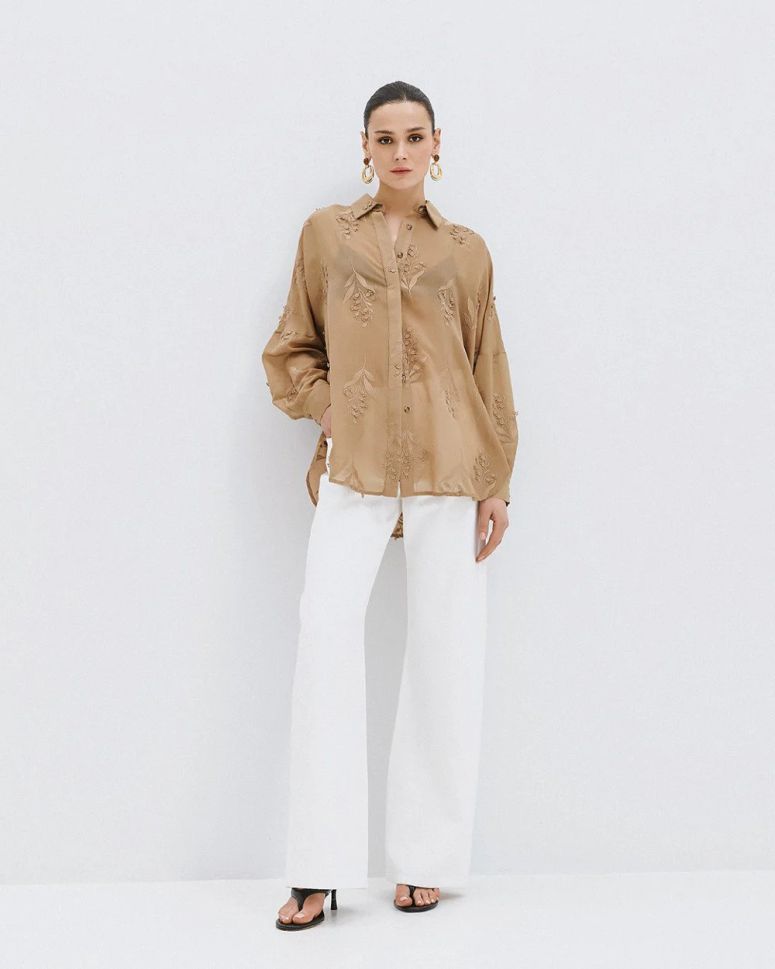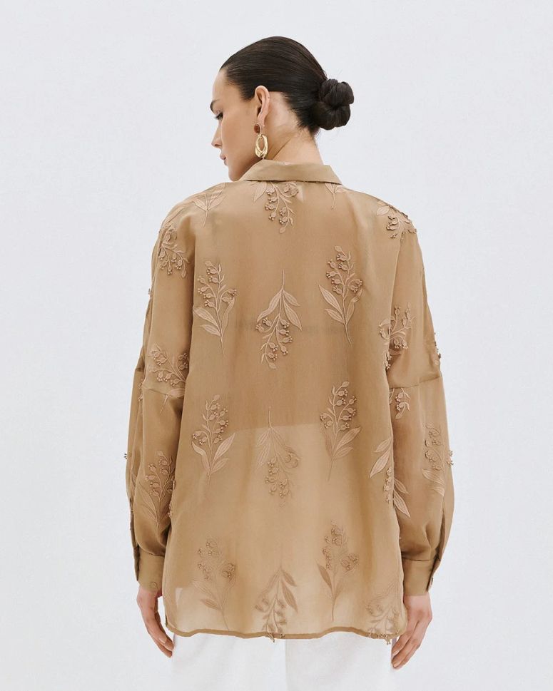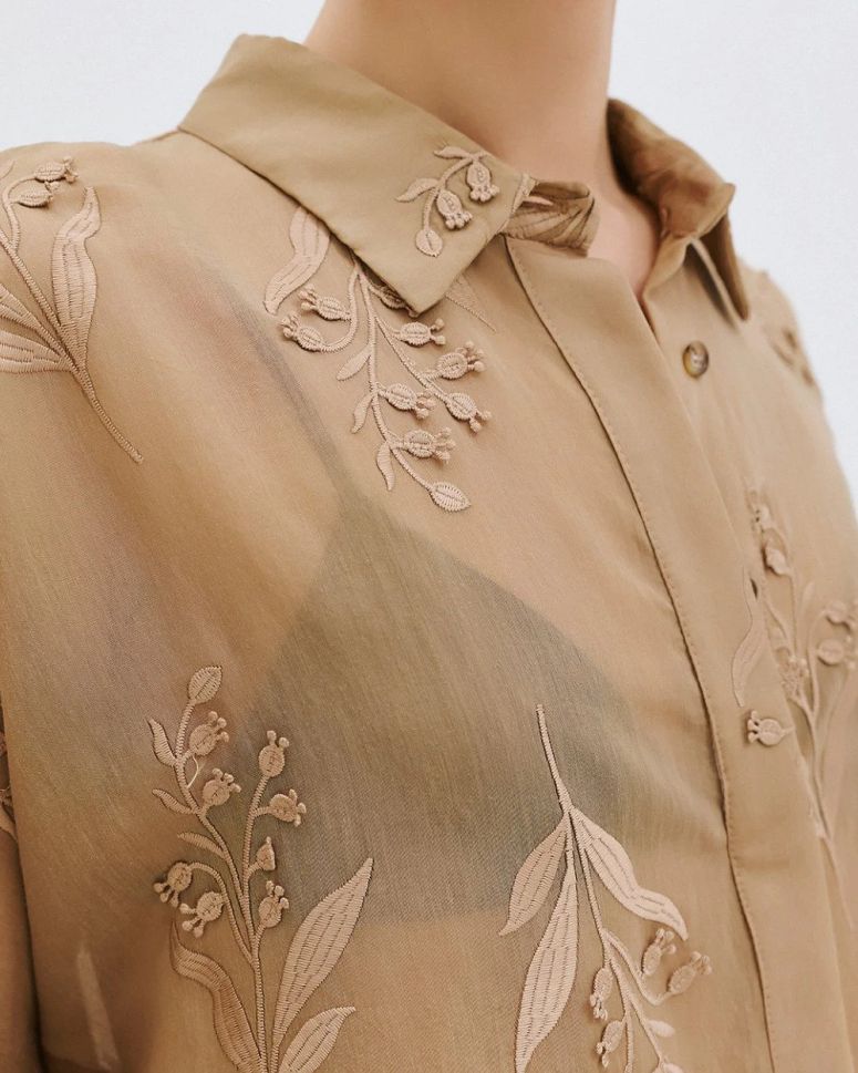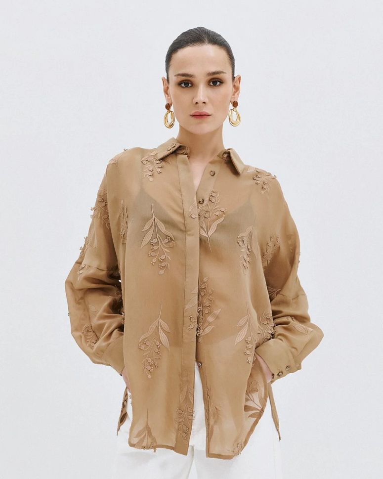 Закопчаването с копчета придава класически вид на ризата, като същевременно позволява лесно обличане и събличане. Флоралната бродерия добавя нежен и изискан акцент, който подчертава женствеността и уникалността на модела.