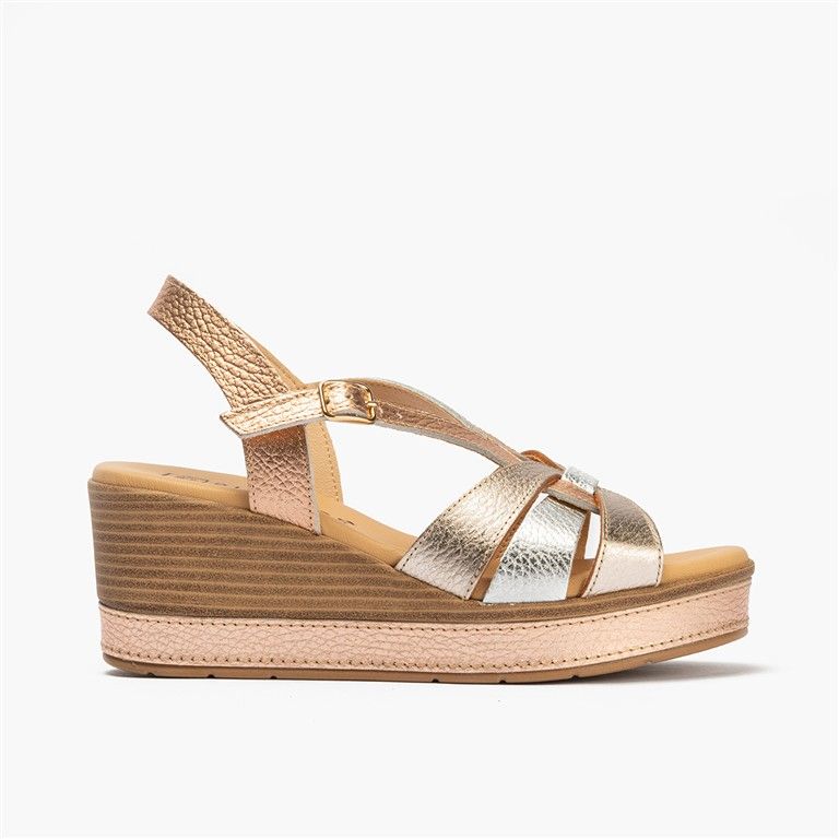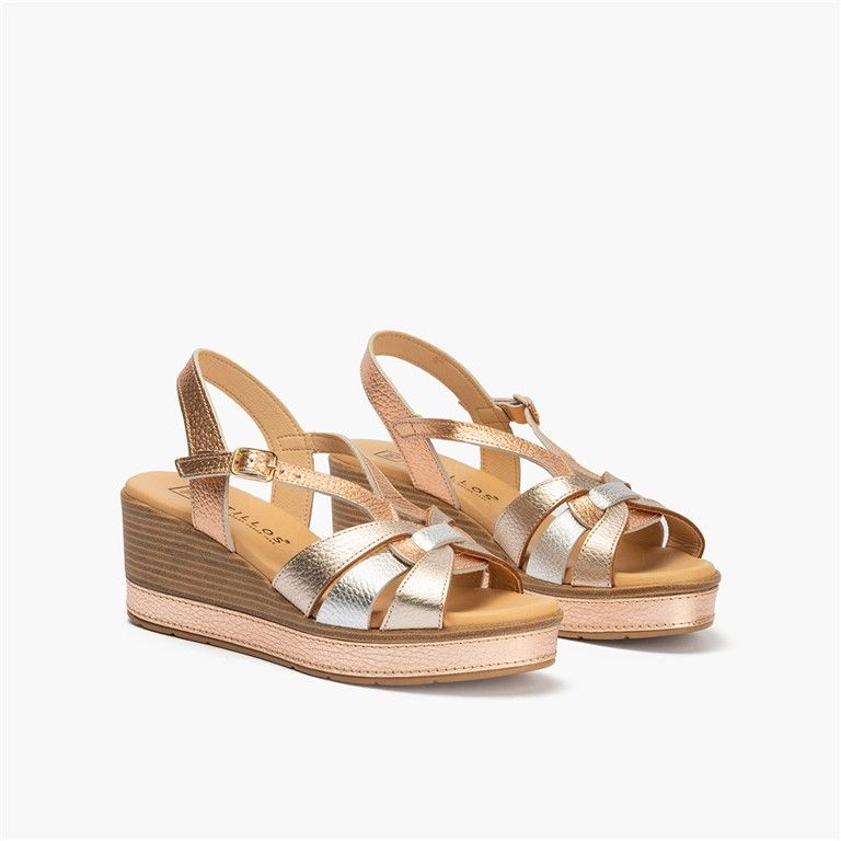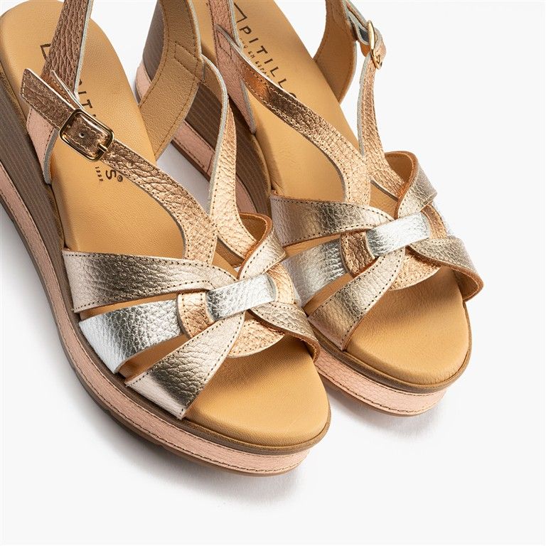 Златни дамски сандали на платформа PITILLOS - съчетание на стил и комфорт! Изработени от естествена кожа, тези сандали ще ви осигурят елегантна визия и удобство през целия ден.