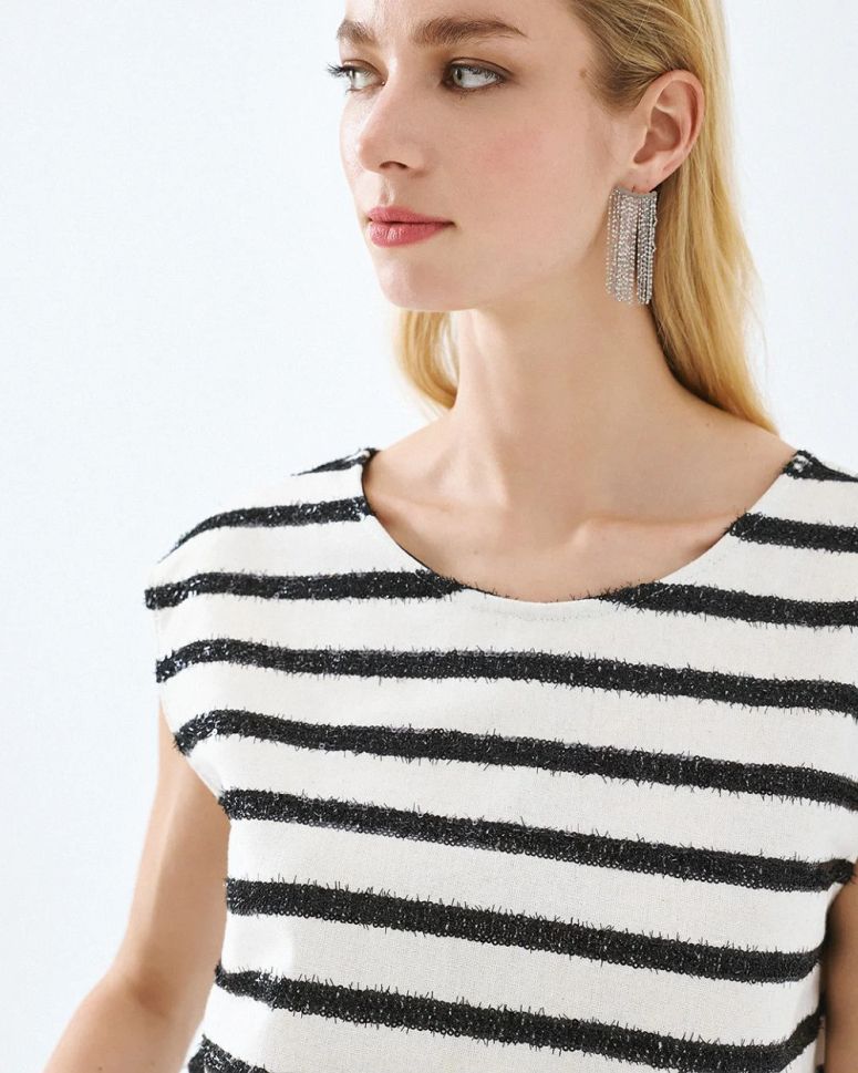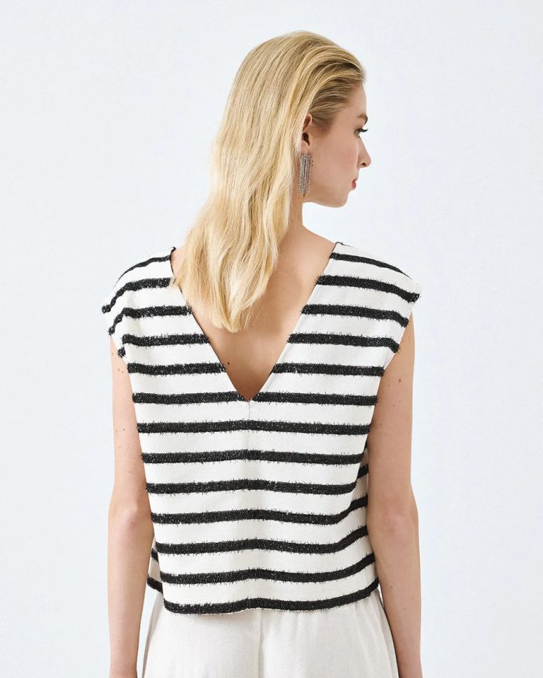 Тази блуза се отличава със своя завладяващ дизайн с контрастни райета, който привлича погледите и добавя модерно излъчване към вашата визия. Елегантният V-образен гръб придава изтънченост и женственост, като същевременно запазва усещането за комфорт.