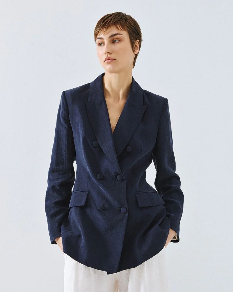 Това сако се отличава със своя изчистен дизайн и луксозен сатенен блясък, който придава на визията ви нотка на изтънченост. Наситеният мастилено син цвят е универсален и лесно се комбинира с различни тонове и стилове.