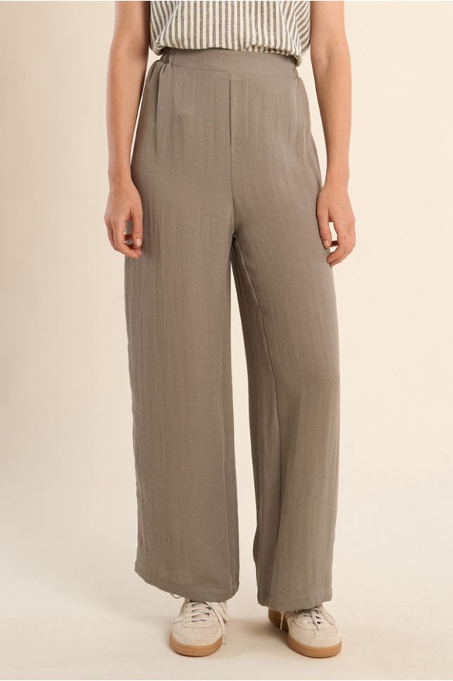 За максимално удобство, панталонът е проектиран с висока ластична талия. Тя осигурява перфектно прилягане без стягане, адаптирайки се към Вашия силует и гарантирайки комфорт през целия ден. Високата талия подчертава женствените извивки и допринася за издължен и елегантен вид.