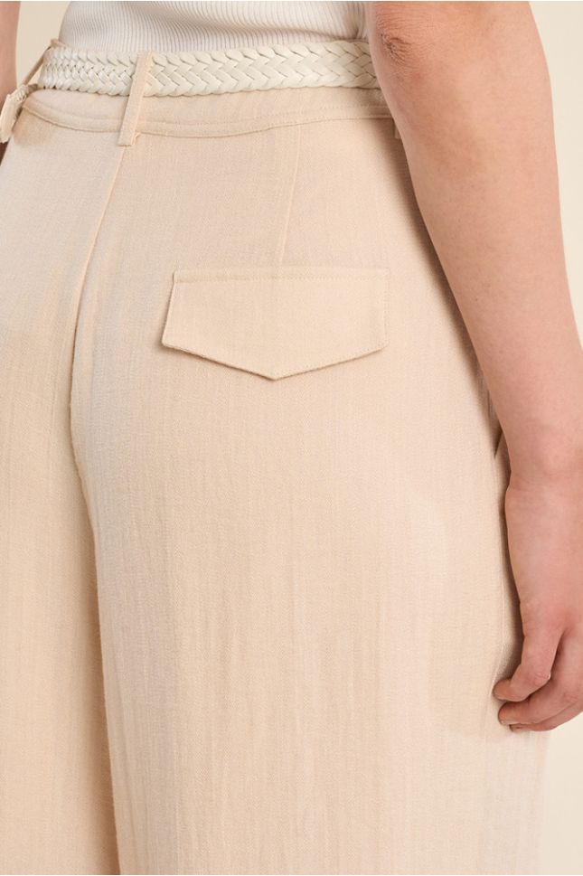 Панталонът е представен в изискан пясъчен цвят – нюанс, който е синоним на елегантност и универсалност. Този неутрален и земен тон е изключително лесен за комбиниране с разнообразни цветове и десени, което го прави идеален за създаване на безброй стилови комбинации. От свежи бели ризи и пастелни блузи до ярки топове и модерни сака – пясъчният цвят ще бъде идеалната основа за всяка Ваша модна визия, независимо от сезона и повода.