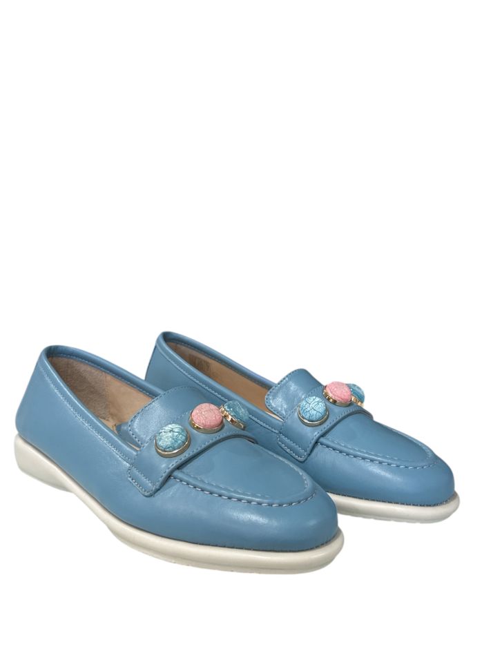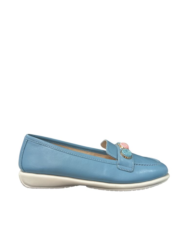 Моделът е с анатомична кожена стелка за оптимален комфорт през целия ден. Акцент са атрактивните цветни камъни в предната част. С дизайн за директно обуване и подметка с височина 2 см, тези обувки са синоним на лекота и удобство.